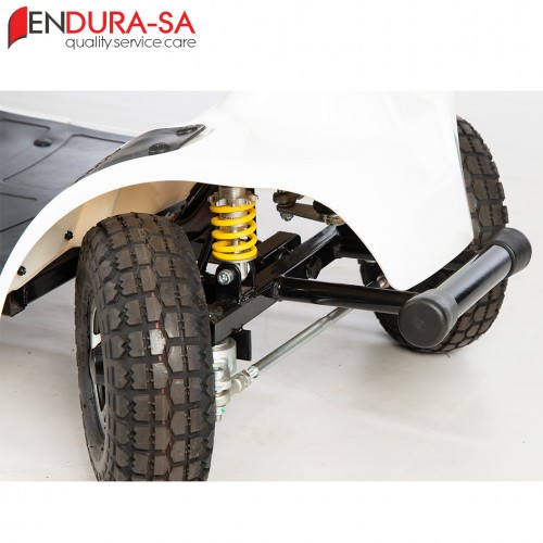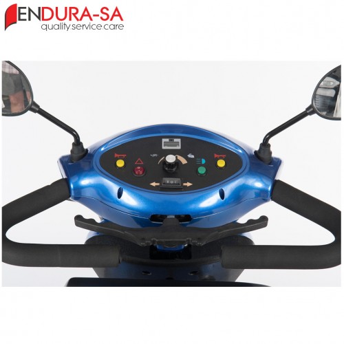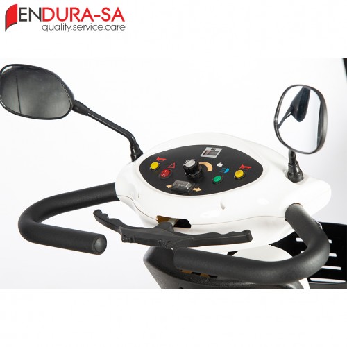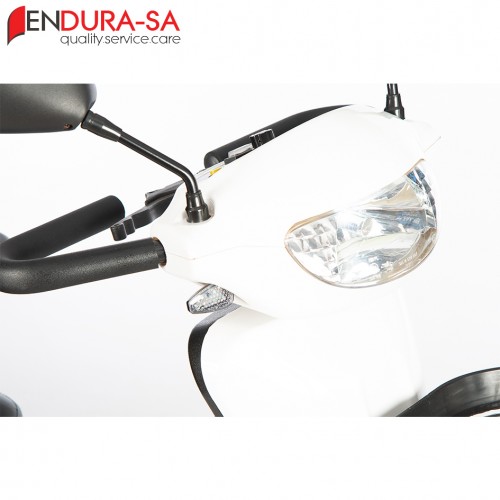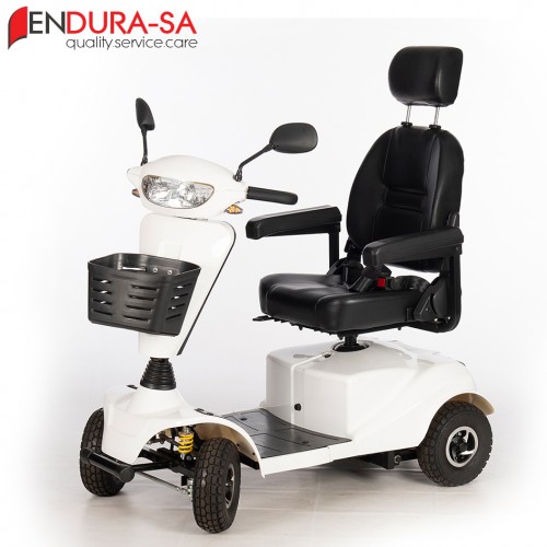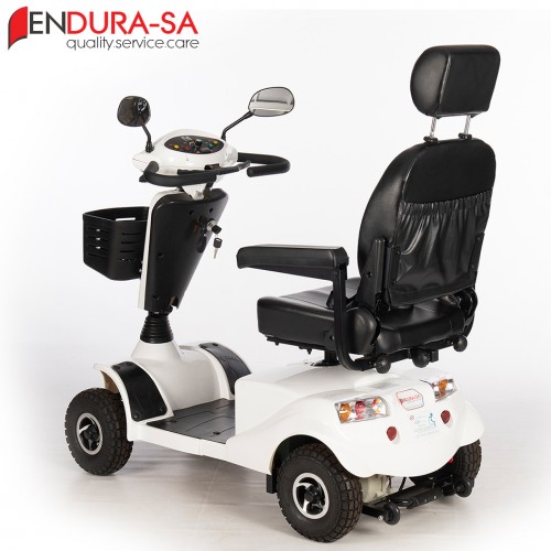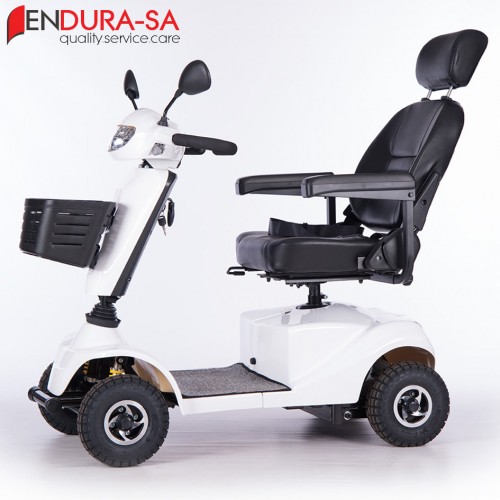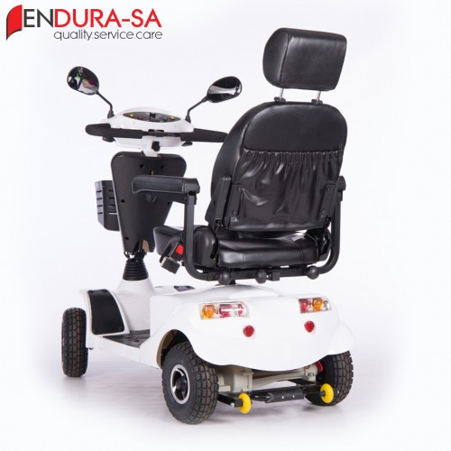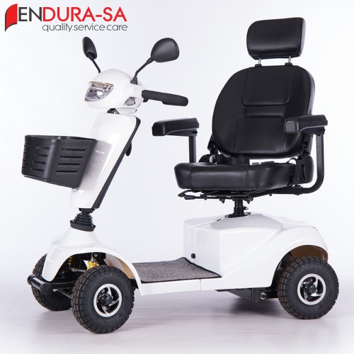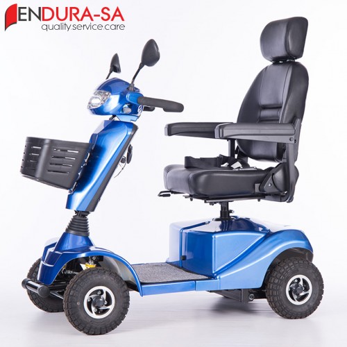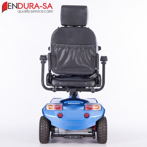 Our Endura LandCruiser Scooter, with its fashionable design, is a strong heavy-duty mobility scooter with a weight capacity of 160 kg. Front & rear suspension. Enough legroom and short turning radius. Flip back, width & height adjustable armrests, swivel & adjustable seat, LED lights, indicators & horn. Manual recline function.